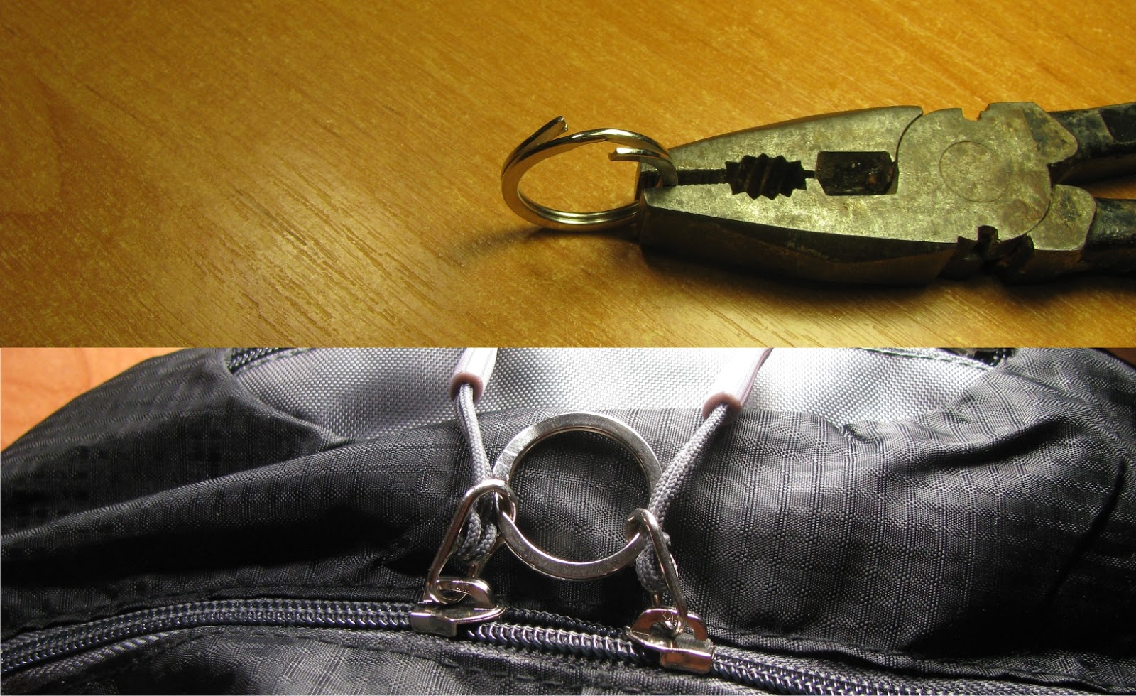 И так же, под ситуацию, брал плоское кольцо для ключей и отгибал пассатижами края. Для фиксации бегунков молнии. Конечно можно, как обычно переплести шнурки бегунка, но мне кажется так надежнее.